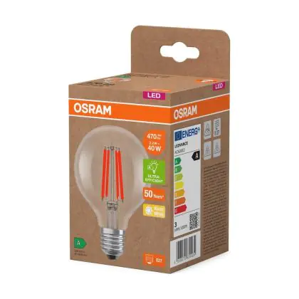 Die Osram LED Lamps E27 Globe Fadenlampe Klar 2.2W 470lm - 827 Extra Warmweiß | Ersatz Für 40W ist eine effiziente E27 LED-Lampe mit Retrodesign und der perfekte Ersatz für Ihre konventionellen 40W Lampen mit E27. Zudem strahlt sie Licht in der Farbtemperatur 2700K - Extra Warmweiß aus und punktet durch eine lange Lebensdauer.