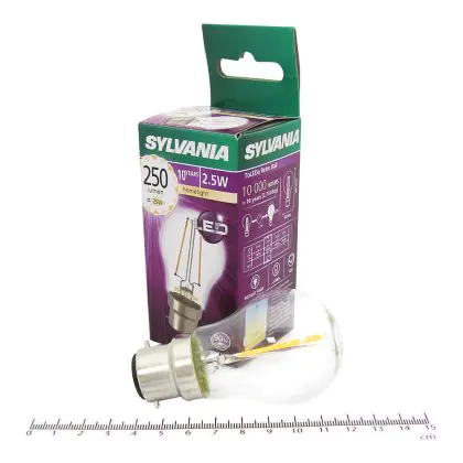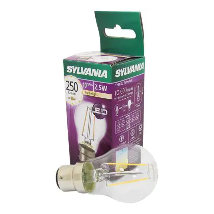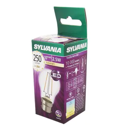Die Sylvania ToLEDo Retro Ball B22 ist eine sehr effiziente LED-Lampe. Ihr Verbrauch beläuft sich auf lediglich 2,5 Watt. Gleichzeitig bietet sie jedoch Ersatz für ein traditionelles Leuchtmittel von 25 Watt. Damit sparen Sie ca. 90 % Ihrer sonstigen Energiekosten ein. Die LED besitzt einen B22-Sockel und ist in Kugelform erhältlich. Sie spendet extra warmweißes Licht mit einer Farbtemperatur von 2.700 Kelvin.